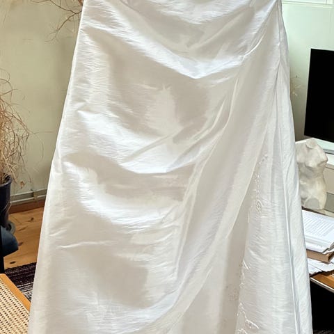 Kaunis teetetty täyspitkä mekko polyesteri/elastaani-neulosta. Kokovastaavuus 38-40. Teetetty promootiojuhlaan, mutta soveltuu myös yksinkertaiseksi häämekoksi. Mekon päällä Kreikasta hääliikkeestä ostettu o-aukkoinen neulos, joka lyhyr edestä ja täyspitkä takaa. Myynnissä 50 eurolla erikseen. Nouto Helsingin Kalliosta.