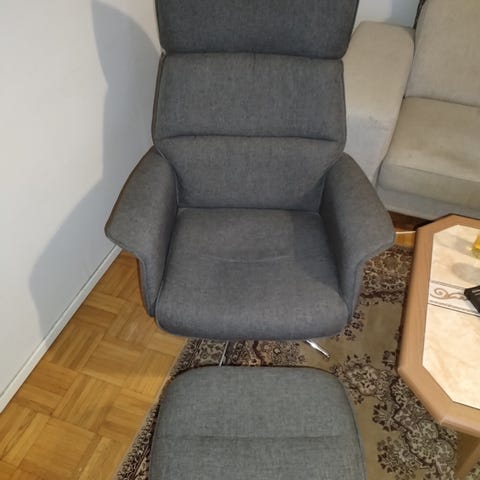 Alura kangasverhoiltu nojatuoli ja rahi, joissa on metallijalat. Nojatuolissa on korkea selkänoja, pylrivä istuin, selkänoja taittuu alaspäin ja pehmustetut käsinojat. Rahi on yhteensopiva nojatuolin kanssa.