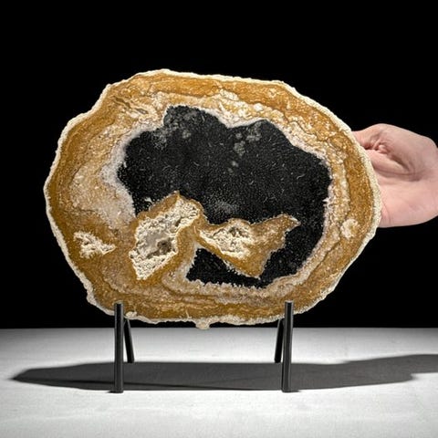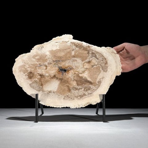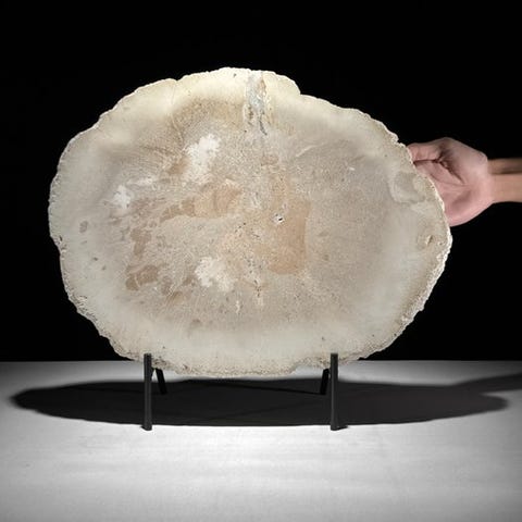 Upea pala muinaistunutta palmujuurta räätälöidyllä jalustalla.Kaunis viipale fossiilipalmun rungosta, jossa on upeita sävyjä ja tyypillinen puhkeama. Kuori on selvästi näkyvissä ulkopuolella, ja palmujen tyypillinen muodostuma erottuu keskellä. Osan sisäosasta on geodetisesti kiteytynyt. Viipale on erittäin kauniisti kiillottu, mikä tekee yksityiskohdat näkyviksi.Likimääräiset mitat - jalustan kanssa:# Korkeus: 27,5 cm, Leveys: 26,5 cm, Viipalepaksuus: 2,1 cmNoin mitat - ilman jalustaa:# Korkeus: 23,7 cm , Leveys: 26,5 cm, Viipaleen paksuus 2,1 cmVastuuvapauslauseke- Huomioithan, että yksi kuvista on otettu hämärässä studiolla, ja värit voivat vaihdella ympäristön mukaan.Paino, joka mainitaan, sisältää pakkausmateriaalin.LähetysKohde lähetetään seurantanumerolla DHL Parcelin, DPD:n tai postNlin kautta. Seuranta päivittyy Catawiki-luettelossasi, kun pakettisi on jätetty postiin.Ole hyvä ja tarkista säännöllisesti välttääksesi pakettisi palautumisen meille, jolloin ostaja vastaa toisen lähetyksen toimituskuluista.Seurantaan Espanjaan ja Portugaliin käytä tätä linkkiä ja lisää Catawiki-erästäsi saatu seurantanumero.https://clientesparcel.dhl.es/LiveTracking/HomeME EMME YHDISTÄ TOIMITUKSIA!!!Jos sinulla on kysyttävää paketistasi, ota meihin yhteyttä Catawiki-viestipalvelun kautta. Pyrimme vastaamaan kolmessa työpäivässä.