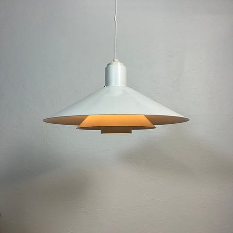 Tanskalainen riipus klassisella monivärijärjestelmällä.Vintage-lamppu, jonka on valmistanut Design Light A/S.Monisävyjärjestelmä levittää valon huoneeseen siten, että lamppu ei näy.Vintage-kunto. Käytön merkkejä.Se käyttää "tavallista" E27-lamppua ja on käyttövalmis.Halkaisija: 47 cm.