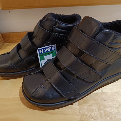 Uudet mustat APEX terveyskengät. Ilmeisesti Apex ambulator. Myydään koska ostin hätäpäissäni liian isot. Koko 9 1/2 vastaa varmaan n. 40 kokoa. Leveä lesti. Iskuja vaimentavat kaksi pohjallista, jossa toisessa lukee anti-shok. Saa tulla sovittamaan. Fysioterapeutilta ostetut. Käytetään esimerkiksi nivel- ja diabetesongelmissa. Normaalihinta reilusti yli satasen. Näissä lukee että naisten malli mutta miksei sopisi miehellekin.