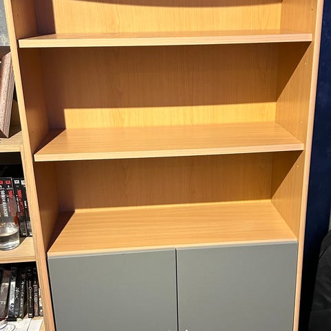 Puunvärinen kirjahylly, jossa yläosassa lasiovelliset vitriinikaapit ja alaosassa umpiovelliset kaapit. Keskellä avohyllytilaa kirjoille tai muille tavaroille. Sopii esimerkiksi olohuoneeseen tai työhuoneeseen kirjojen ja esineiden säilytykseen ja esillepanoon. Nouto Hämeenkyröstä