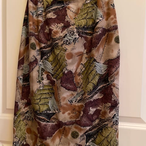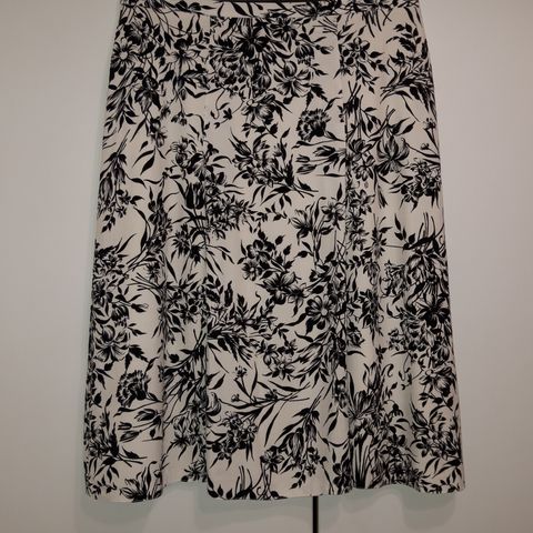 Musta-valko-raidallinen laadukas Stockmannilta ostettu hame, vyötärökoristeena kullattu koru "B". 50-luvulle tyypillinen nappikiinnitys ja koristenauha helmassa. Puuvilla.