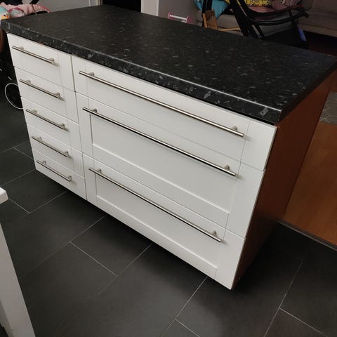 Keittiöallas ja hana. Altaan äärimitat 63x51cm. Tasot 279x60 tasossa altaan reikä ja taso 229x60 jossa lieden reikä.