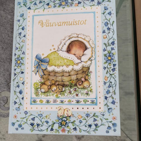 96-sivuinen, vaaleanpunasävyinen Vauvamuistot-kirja. Kuvissa muutamia esimerkkisivuja.