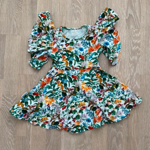 Myydään ihana Metsolan kukkamekko koossa 86/92. Ostettu meille yhdellä kerran käytettynä ja käytetty meillä paremmissa menoissa. Yhden langannousun huomasin (kuva).