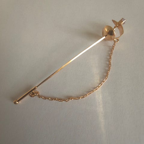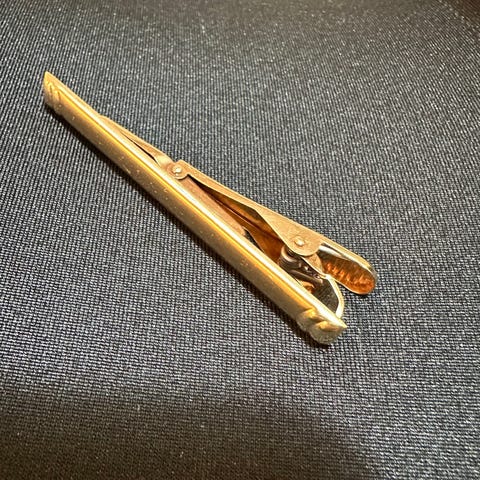 Kultainen solmioneula. Materiaalina kulta, leimojen mukaan 585-pitoisuus. Klassinen malli, jossa jousimekanismilla toimiva klipsi. Sopii käytettäväksi solmion kiinnittämiseen ja viimeistelemään pukeutumista juhla- tai arkitilanteissa.