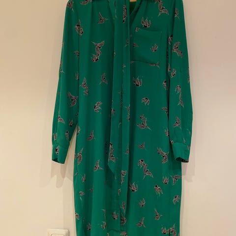 Harvinainen klassikko uuteen kotiin 🐆 Silkkinen DVF Diane von Fürstenberg naisten mekko, koko 36 - menee 34-38. Materiaali 100 % silkkiä. Mekossa on pitkähihaiset hihat, kaulus ja vyötärölle solmittava vyö. Kuosina on vihreäpohjainen kiipeävä pantteri.