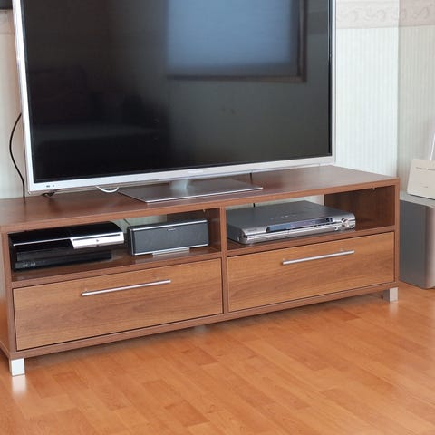 Myydään tv-taso. Maalattu itse tasaisen valkoiseksi. Taso on pyörien päällä. Alahyllyssä on takaseinä, mutta ylemmän hyllyn seinä on avoin.