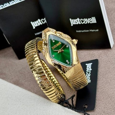 Upea Just Cavalli -kello, viitenumero JC1L358M0055, malli Gemma Snake watch. Kellon voimanlähteenä on quartz-koneisto, ja kellossa on helposti luettava kellotaulu sekä erottuva muotoilu kellotaulussa, ja bezelillä on käärmekuva sekä jalokiviä. Myös ranneke on koristeltu säännöllisesti. Ranneke on lisäksi joustava, joten se sopii lähes kaikille ranteille.Uusi ja käyttämätön!Toimitukseen sisältyy kuvien mukaiset (tyhjät) tarvikkeet kuten kuvassa.Kvartsikellomateriaalikaappi: teräs.halkaisija: noin 23 mm ilman kruunuadikte: noin 8 mmHihnan pituus: n. 18 cm. sis. kello.Ikä: 2020+Se lähetetään vakuutettuna.Valokuvien ottaminen on osa kuvausta.