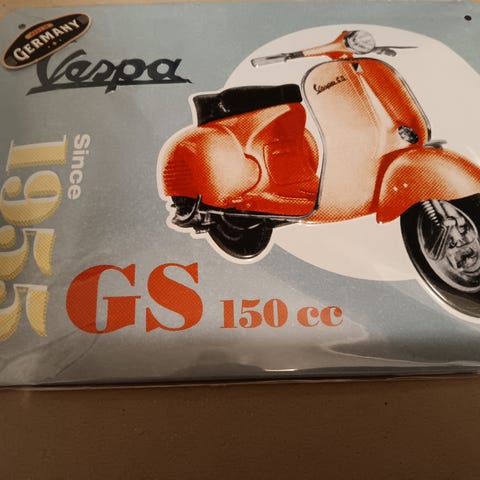 Muoveissa oleva uusi Vespa peltikyltti. Koko n. 20,5cm x 14,5cm. Lähetys onnistuu kirjekuoressa, postikulu 5,50€