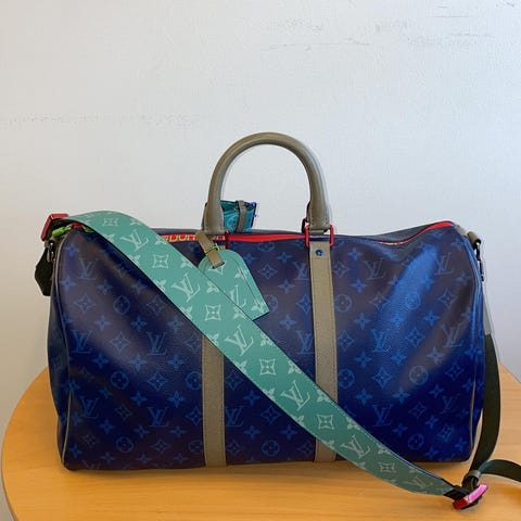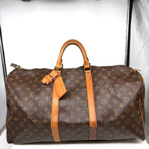 Myydään Louis Vuitton klassikko, Keepall Bandouliere 45. Ruskea monogrammikangas, mustat nahkaosat.