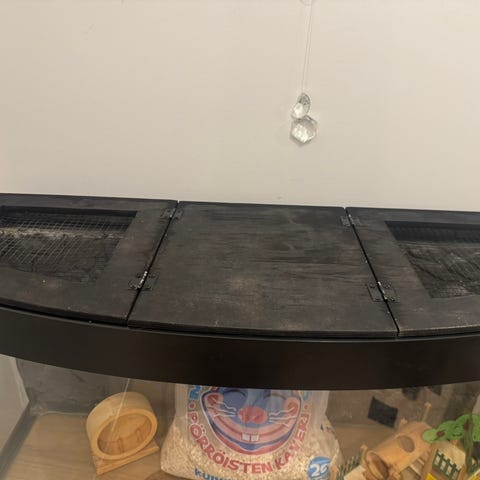 Tarjolla koko setti hamsterin hoitoon. Terraario, juoksupyörä, ruokakuppi, juomapullo, nukkumakoppi, kaksipuoleinen kuva terraarion takaseinään sekä kuljetuskoppa ja jopa valjaat ulkoilutukseen. :)