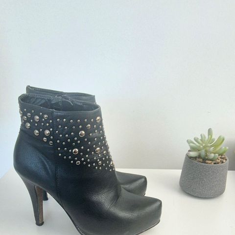 Mango-merkkiset korolliset nilkkurit, mustat. Koron korkeus 9 cm, kantikas kärki. Zalandolta uutena ostetut ja käytetyt vain 3-4 kertaa, joten ovat erittäin hyvässä kunnossa.