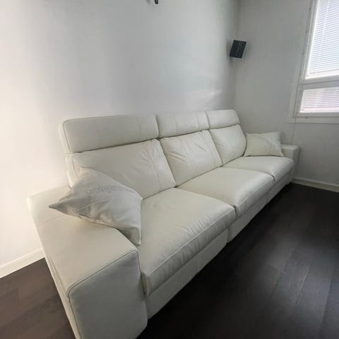 3 paikkainen musta nahkainen mekanismisohva kahdella mekanismilla, joiden avulla jalat saa nostettua istuma-asennosta puolimakuuasentoon. Keskiosassa käännettävä taso, jossa kaksi upotettua mukitelinettä.