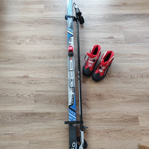 Lasten suksipaketti. Sukset, sauvat ja monot. Monot kokoa 35. Mitat näkyy kuvissa.