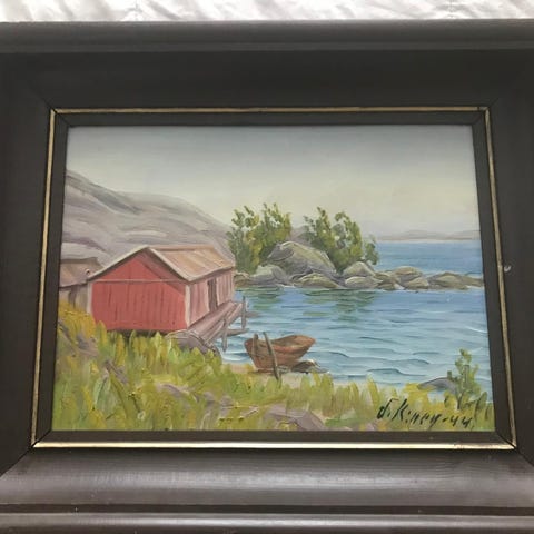 Öljyvärimaalaus kovapinnalle, jossa on kuvattuna järvimaisema veneineen ja puineen. Signeeraus J(i?). Sorvali.Kehyksissä on havaittavissa kulumaa ja halkeamia. Maalaus itsessään on hyvässä kunnossa.