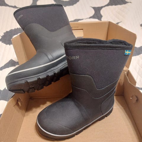 Trekstan kevyet thermosaappaat. Villasekoite vuori. Luvataan lämpöä -20 asteeseen asti ja kylmäjalkainen lapsikin kehunut. Meillä ehtineet jalkaan vain pari kertaa, eikä käytön jälkiä villavuoren vähäistä nyppyä lukuunottamatta ole.