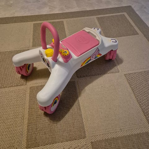 Söpö yksisarvinen potkuauto. Sarvi on töötti ja istuinosa on kiva luukku. Käytetty vain sisällä!
