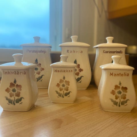 Arabia maustepurkit keramiikka valkoinen korkkikansi. Neljä neliönmuotoista valkoista keramiikkapurkkia mustalla koristekuviolla ja tekstillä (tee, kaneli, inkivääri, neilikka). Tekstit purkeissa neljällä kielellä : suomeksi, ruotsiksi, englanniksi ja ranskaksi. Purkeissa irrotettavat luonnonkorkkiset kannet. Sopivat esimerkiksi mausteiden ja teen säilytykseen keittiössä.