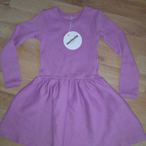 Metsolan kaunis ribbimekko, koko 98/104. Mielestäni nafti mitoitus. Lilan/violetin sävyiset raidat. Meille uutena hankittu enkä muista varmaksi, kerkesikö yhtään kertaa päälle. Lähestulkoon uutta vastaava kunto siis. Hajusteeton, eläimetön talous.