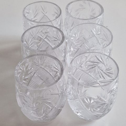 Kristalliset snapsilasit. Helähtävät kauniisti napauttaessa kuten kristallin kuuluukin. Hyvin vähän käytetyt. Neljä kappaletta.