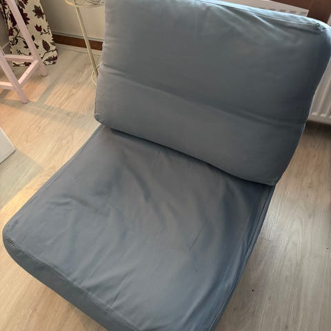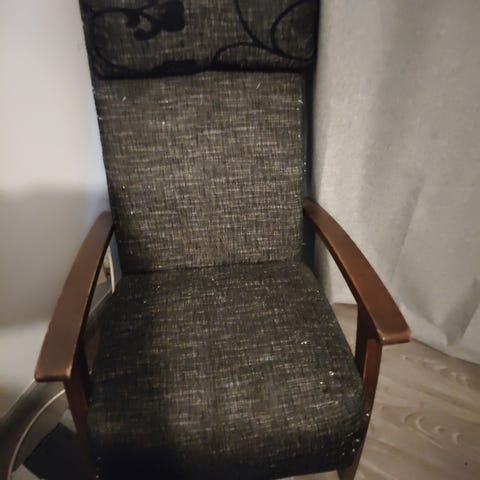 Kaksi lepotuolia. Toisen yksi Sauma auennut ja pitää ommella. Toinen täysin kunnossa.