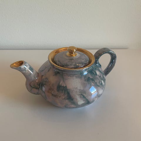 Myydään Arabian Kirjo-teekannu. Leveys nokasta kahvaan noin 22 cm. Kultauksessa kulumaa.