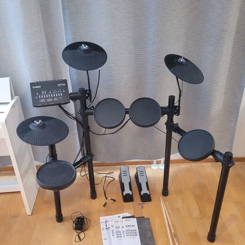 Uudenveroinen Yamaha DTX402K sähkörumpusetti, jossa mukana kaksi pedaalia ja rumpukapulat + lisätarvikkeet.