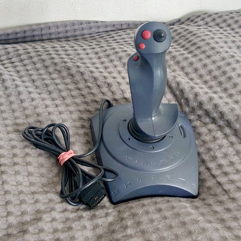 Logitech WingMan Interceptor joystick tietokoneelle. Johdollinen ohjain, jossa useita painikkeita kahvassa ja jalustassa. Sopii lentosimulaattoreihin ja muihin peleihin, jotka tukevat joystick-ohjausta. Liitäntä 15-nastaisella gameport-liittimellä (ei USB).