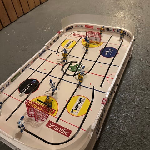 Stiga pöytälätkä/ pöytäjääkiekko. On hyvässä kunnossa. Suomi-ruotsi pelaajat muuten, mutta yksi kanadan pelaaja eksynyt kentälle