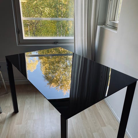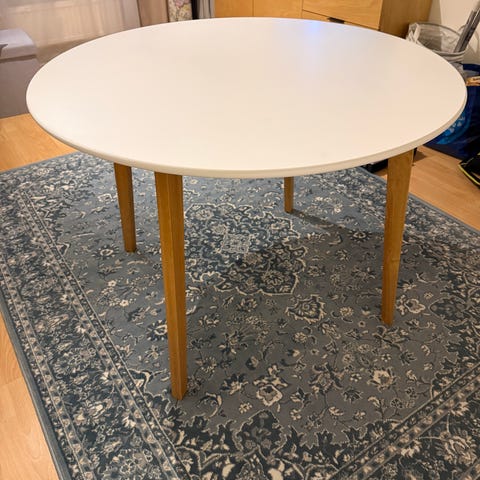 Myydään ISKUsta aikoinaan ostettu ruokapöytä. Pöydän levein kohta on 105 cm ja molemmista päistä kapeampi 90 cm. Pöytään kuuluu jatkopala 60 cm, mikä ei ole ollut vielä koskaan käytössä. Elämisen jälkiä jonkin verran pöydän pinnassa, mutta pienellä vaivalla siitä saa siistin pöydän.