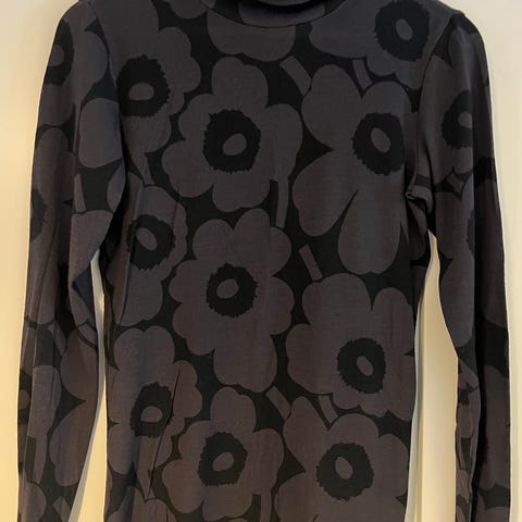 Marimekon käytetty, siisti, Vilina-poolopaita on valmistettu merinovillaribbistä, siinä on vartalonmyötäinen istuvuus ja suora leikkaus. Ohuessa poolopaidassa on Unikko-kuosi ja raakareunat hihansuissa sekä helmassa.