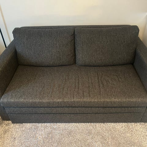 Vuodesohva, jossa kaunis sinisävyinen kuviollinen veluuri kangasverhoilu. Sohvassa on kolme istuinpaikkaa ja pyöristetyt käsinojat. Sohva voidaan avata vuoteeksi, jossa on erillinen patja ja metallirunkoinen mekanismi puusäleiköllä. Sopii olohuoneeseen tai vierashuoneeseen istuma- ja nukkumapaikaksi. Sohva on painava. Ensimmainen kerros (yksi portaikko). Se ei mahdu hissiin.