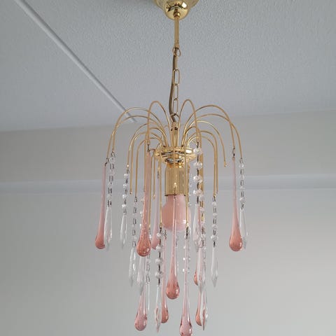 Valkoinen metallikupu halkaisijaltaan 21cm ja huurrelasinen varjostin. Alimmassa lasiraidassa pieni tummentumajuoste. Katon muovikupu vuosikymmenten kellastama. Muuten kunto varsin hyvä. Merkki on mahdollisesti Valinte.