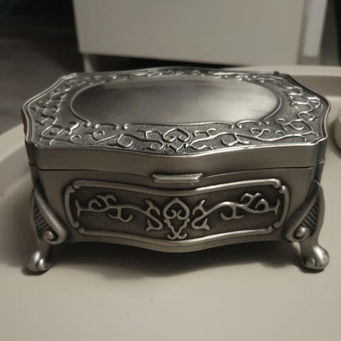 Suomen leijonalla koristeltu tina rasia. Sarana ehjä. Rasian koko 7x5cm.
