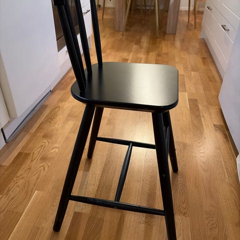 IKEA lasten tuoli, väri valkoinen. Malli Ingolf. Tuolissa on korkea istuinkorkeus ja selkänojassa ristikkomalli, jaloille tukipuu. Sopii lapselle istuimeksi esim. Ruokapöytään.