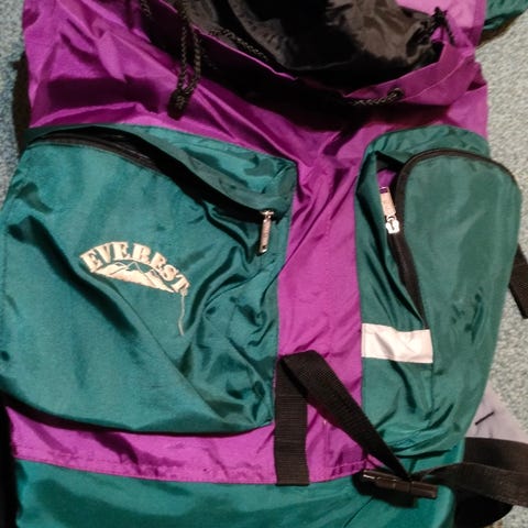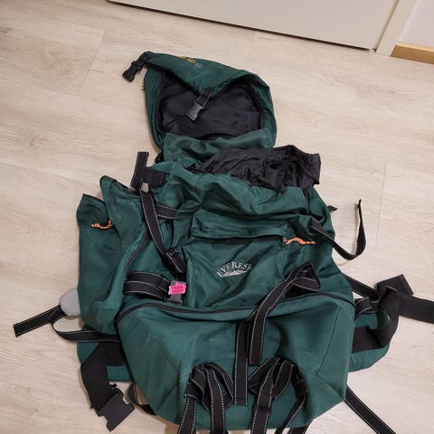 Everestin perusrinkka 60l. Kunto hyvä, selkäpuolella vanhoja tarroja kun rinkka ollut matkoilla mukana. Ala- ja yläosan välissä on veroketjullinen välipohja. Kaikki kiinnikkert kunnossa.