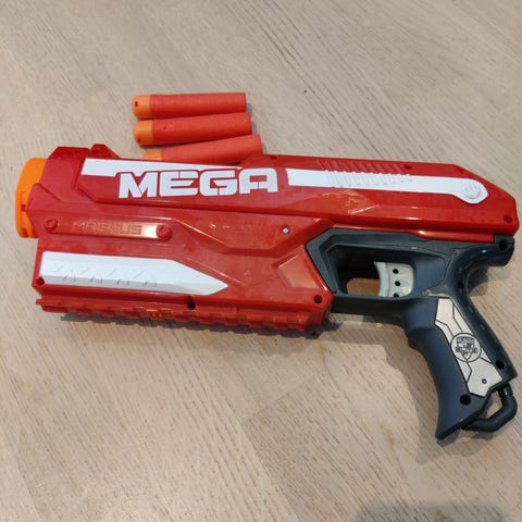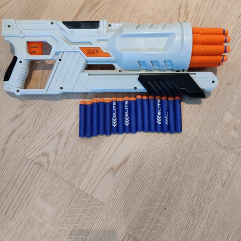 6 pehmonuoliaseita ja panokset niihin. Yksitäysiautomaattinen sähköllä toimiva. Yhdessä kiikaritähtäin (ei suurenna). Yksi ampuu kolme panosta samaan aikaan.