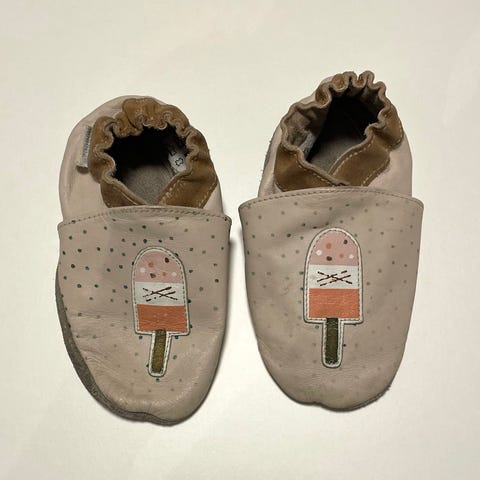 Myynnissä laadukkaat nahkaa olevat tarhatossut. Ohjeellinen koko on 18-24 kuukautta, meillä meni pidempään. Käytön jälkiä pohjissa, joita luonnollisesti tuleekin helposti. Ei reikiä.