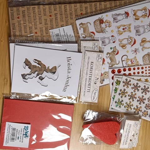 Iso askartelupaketti: paljon leimasimia (n. 138kpl), tarroja (n. 28kpl), sabluunoita (5kpl), pieniä kuviopapereita (n. 130kpl) ja paljon muuta. Suuri osa käyttämättömiä.