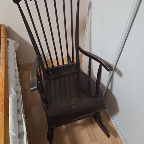 Vanha keinutuoli, materiaali puu ja väri valkoinen. Korkea selkänoja ja käsinojat tarjoavat tukevan istuma-asennon. Keinujalat ovat puuta ja istuin on kiinteä. Ajan patinaa.