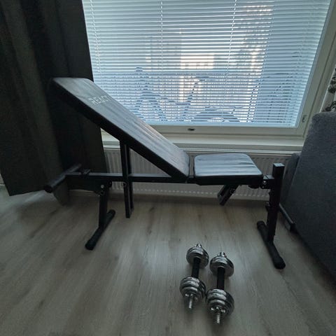 Upouusi, käyttämätön, juuri otettu laatikosta ja koottu. Siinä on rungot, jotka helpottavat siirtämistä, ja se on kevyt.Säädettävä harjoituspenkki, jossa on integroitu preacher-kyynärvarsituki käsivarsien ja hauisten harjoitteluun. Penkissä on pehmustetut mustat istuin- ja selkäosat sekä erillinen kyynärvarsituki. Rungon korkeutta ja selkänojan kulmaa voidaan säätää eri harjoitteita varten. Vatsalihasliikkeisiin ja Soveltuu kotikuntoiluun ja voimaharjoitteluun levytankojen tai käsipainojen kanssa.