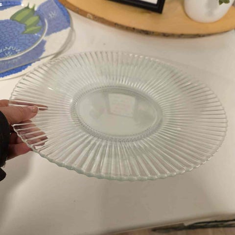 Kaksi jalallista kakkulautasta, kirkasta vanhaa lasia.
