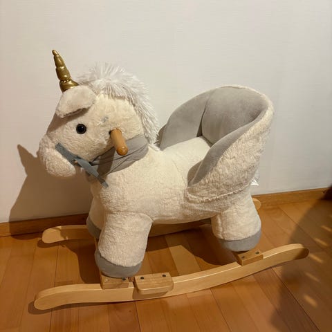 Taaperolle sopiva keinuheppa. Patteri on loppunut mutta ilmeisesti vaihdettavissa hevosen toisesta korvasta. Leikitty mutta ehjä edelleen.