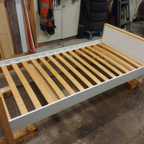 Muurame jolla jatkettava juniorisänky lapselle. Valkoinen runko, jossa suorat ja pelkistetyt linjat. Sopii siirtymävaiheen sängyksi pinnasängystä isompaan sänkyyn. Pientä kulumaa siellä täällä, mutta yleisilme oikein siisti.