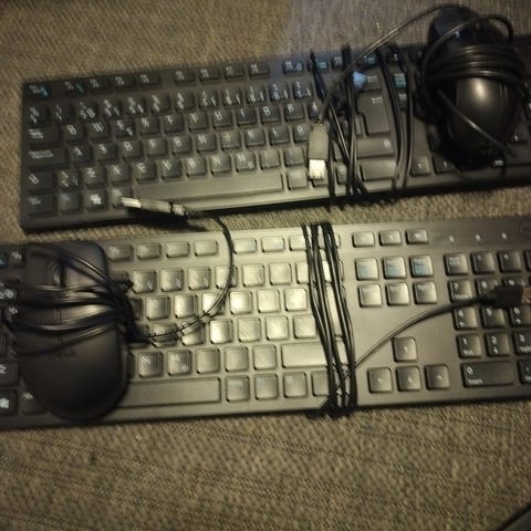 Dell näppäimistö ja Lenovo hiiri USB-kytkennällä. Näppäimistössä kortinlukijan paikka. Soveltuu toimisto- tai kotikäyttöön. Molemmat kunnoltaan erittäin hyvät.