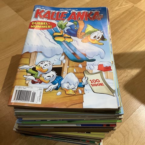 Myydään Kalle Anka ruotsinkieliset sarjakuvalehdet vuodelta 2016. Numerot 1-10 sekä 15-52, yhteensä 45 kpl lehtiä, osa tuplanumeroita. Kerran luettu kunto.