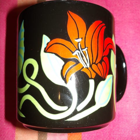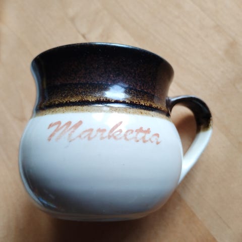 Mukin ulkoreunassa alkuperäinen valuvika joka näkyy kuvissa pieniä pistepainaumia mukin ympärillä