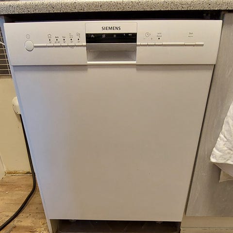 Uudehko Hisense astianpesukone tason alle -asennukseen. Valkoinen etupaneeli ja elektroninen ohjauspaneeli yläreunassa. Koneessa on aterimille paikka ylätasossa.